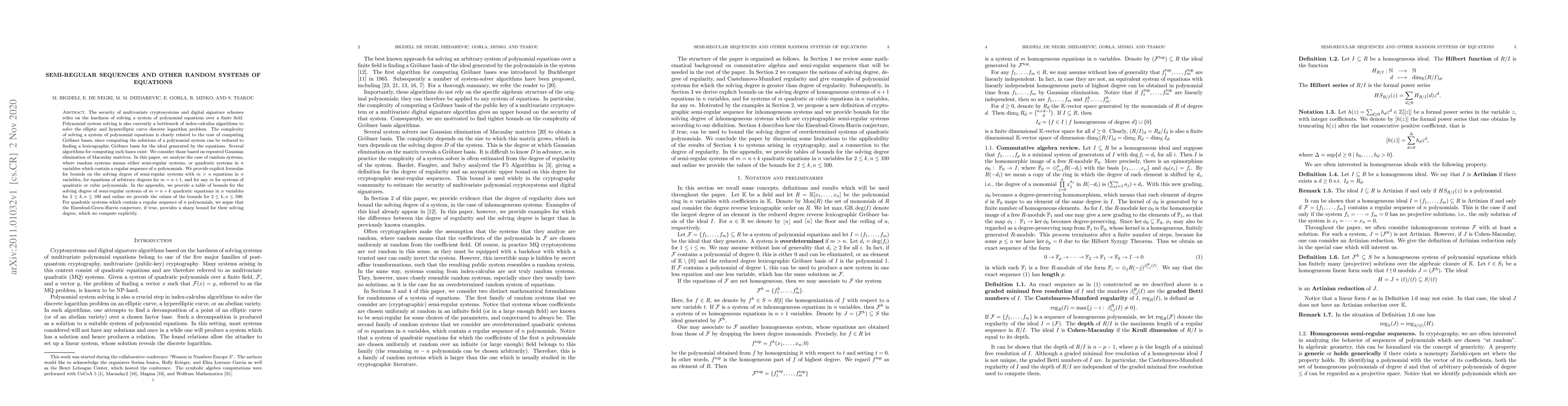 The security of multivariate cryptosystems and digital signature schemes relies on the hardness of solving a system of polynomial equations over a finite field. Polynomial system solving is also currently a bottleneck of index-calculus algorithms to solve the elliptic and hyperelliptic curve discrete logarithm problem. The complexity of solving a system of polynomial equations is closely related to the cost of computing Groebner bases, since computing the solutions of a polynomial system can be reduced to finding a lexicographic Groebner basis for the ideal generated by the equations. Several algorithms for computing such bases exist: We consider those based on repeated Gaussian elimination of Macaulay matrices. In this paper, we analyze the case of random systems, where random systems means either semi-regular systems, or quadratic systems in n variables which contain a regular sequence of n polynomials. We provide explicit formulae for bounds on the solving degree of semi-regular systems with m > n equations in n variables, for equations of arbitrary degrees for m = n+1, and for any m for systems of quadratic or cubic polynomials. In the appendix, we provide a table of bounds for the solving degree of semi-regular systems of m = n + k quadratic equations in n variables for 2 <= k; n <= 100 and online we provide the values of the bounds for 2 <= k; n <= 500. For quadratic systems which contain a regular sequence of n polynomials, we argue that the Eisenbud-Green-Harris Conjecture, if true, provides a sharp bound for their solving degree, which we compute explicitly.