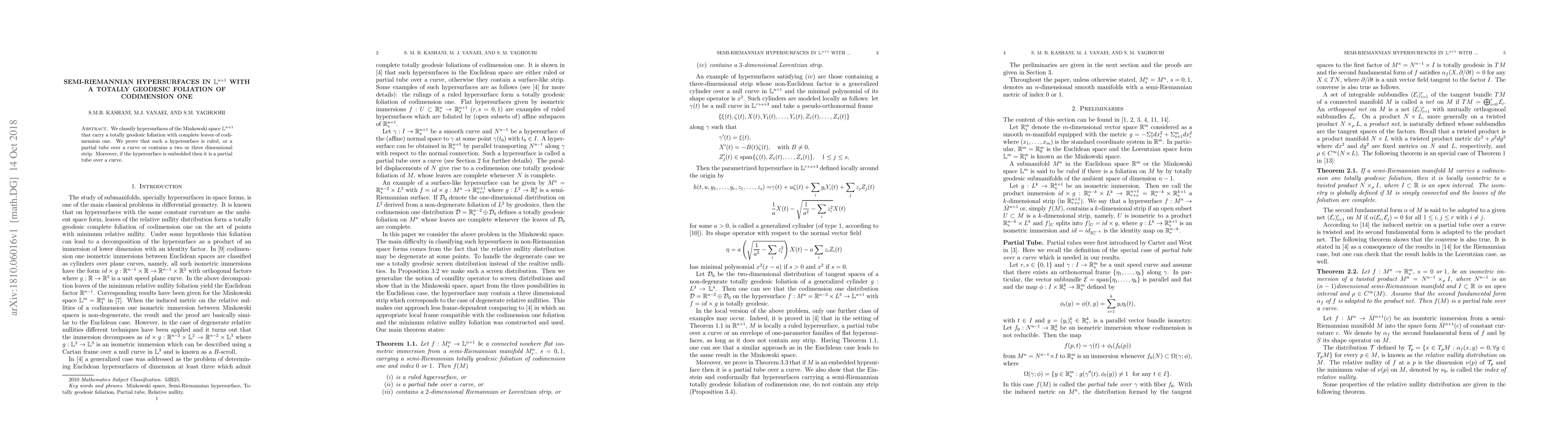 This paper classifies Minkowski space hypersurfaces with a totally geodesic foliation of codimension one, proving they are ruled, partial tubes over a curve, or contain strips. Embedded hypersurfaces specifically are partial tubes over a curve.