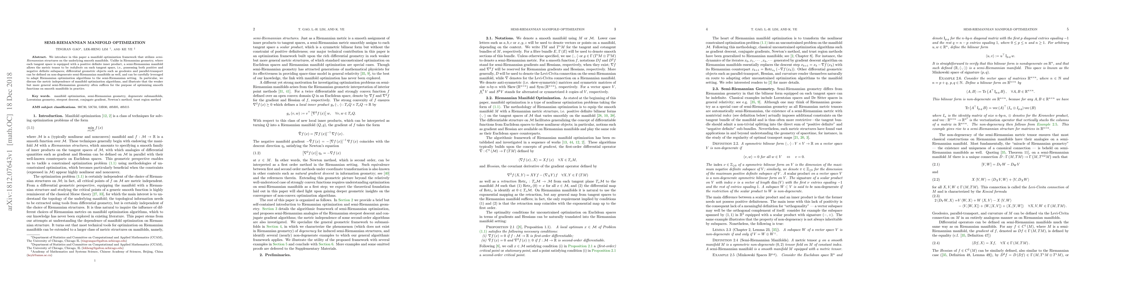 This paper presents a manifold optimization framework for semi-Riemannian manifolds, where the metric tensor is indefinite, allowing both positive and negative subspaces. It adapts Riemannian optimization techniques using differential geometric tools like geodesics and parallel transport, demonstrating that semi-Riemannian geometry can often suffice for practical optimization on smooth manifolds.