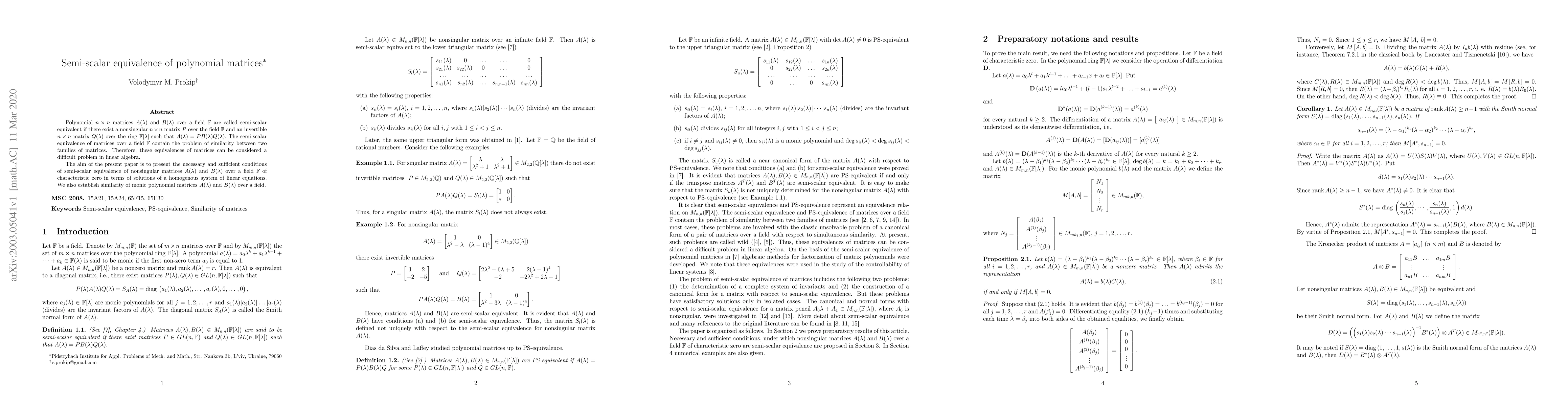 This paper investigates the semi-scalar equivalence of nonsingular polynomial $n\times n$ matrices over a field of characteristic zero, providing necessary and sufficient conditions in terms of solutions to a system of linear equations. It also establishes the similarity of monic polynomial matrices.