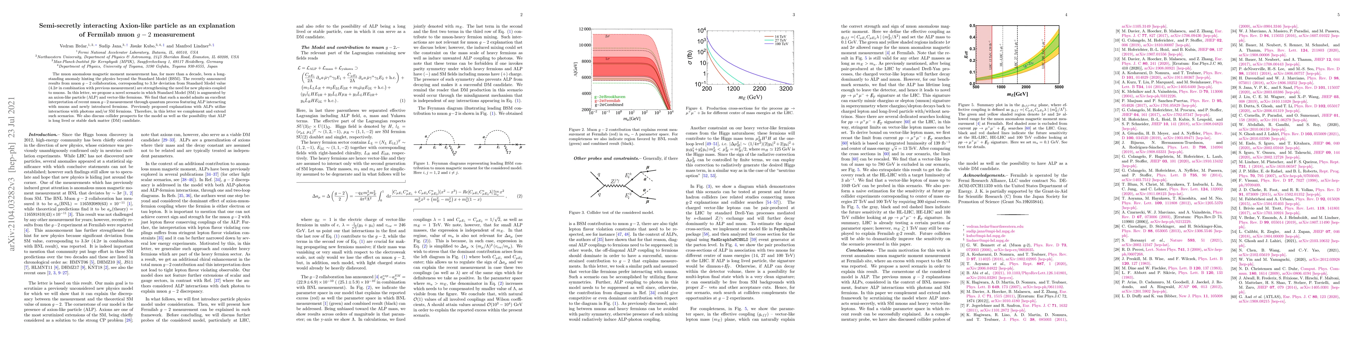 This paper proposes a novel model augmenting the Standard Model with axion-like particles (ALPs) and vector-like fermions to explain the recent muon $g-2$ anomaly, offering a new interaction mechanism distinct from previous photon-based ALP models. The model also explores collider prospects and the potential of ALPs as dark matter candidates.