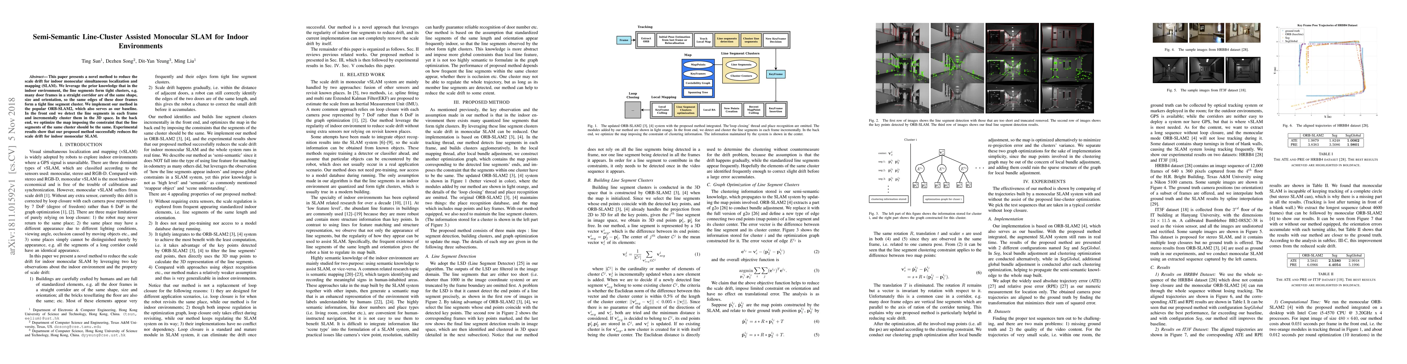 This paper introduces a semi-semantic line-cluster assisted monocular SLAM method to reduce scale drift in indoor environments by leveraging tight line segment clusters, such as door frames, and optimizing the map based on these clusters. The method is implemented within ORB-SLAM2 and demonstrates improved performance in experimental results.