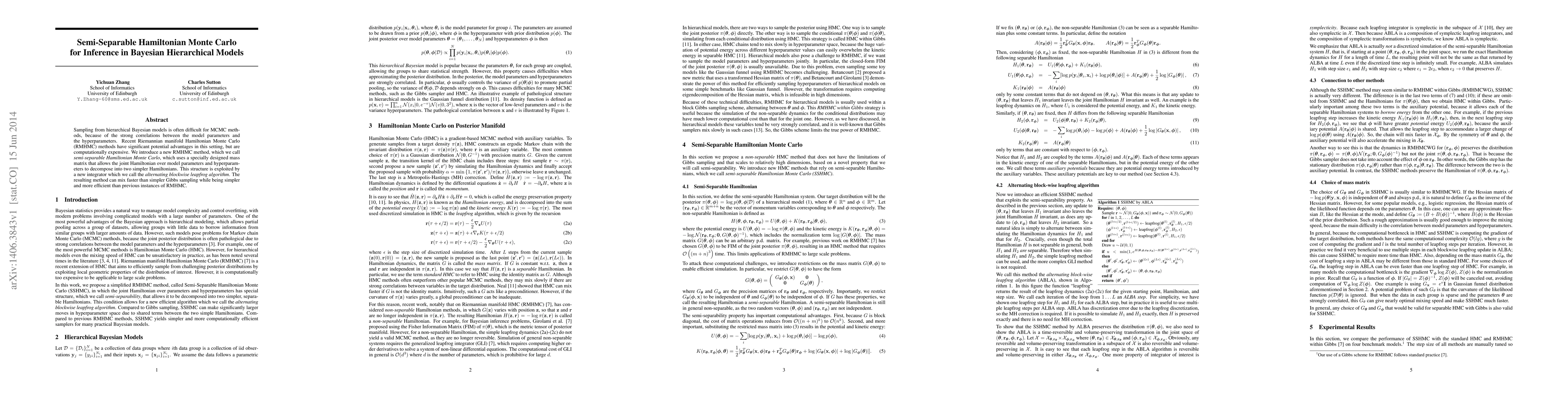 The paper proposes a semi-separable Hamiltonian Monte Carlo method using an alternating blockwise leapfrog integrator to efficiently sample from hierarchical Bayesian models. This new approach decomposes the joint Hamiltonian into simpler parts, achieving faster mixing than Gibbs sampling while being more efficient than traditional Riemannian manifold Hamiltonian Monte Carlo methods.