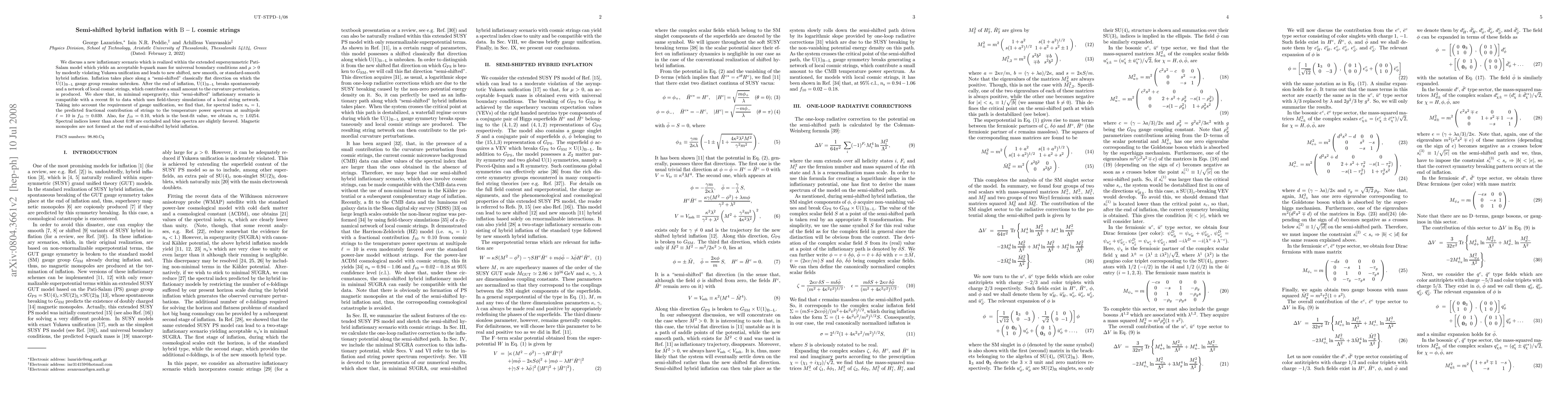 This paper proposes a new inflationary model in an extended supersymmetric Pati-Salam framework, featuring semi-shifted hybrid inflation driven by an unbroken U(1)_{B-L} gauge group, resulting in cosmic strings that contribute slightly to curvature perturbations. The model predicts a small fraction of the temperature power spectrum from string networks, with spectral indices favoring blue spectra and excluding values below 0.98.