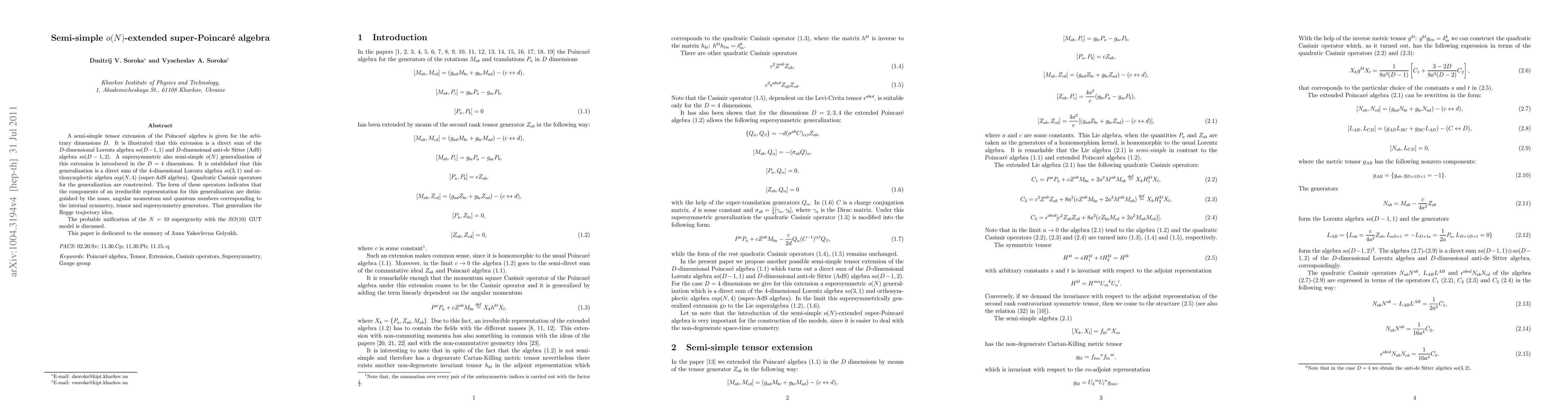 This paper introduces a semi-simple tensor extension of the Poincaré algebra, combining the Lorentz and anti-de Sitter algebras, and extends it to a supersymmetric form in D=4 dimensions, incorporating the orthosymplectic algebra. It discusses potential unification with N=10 supergravity and SO(10) GUT models.