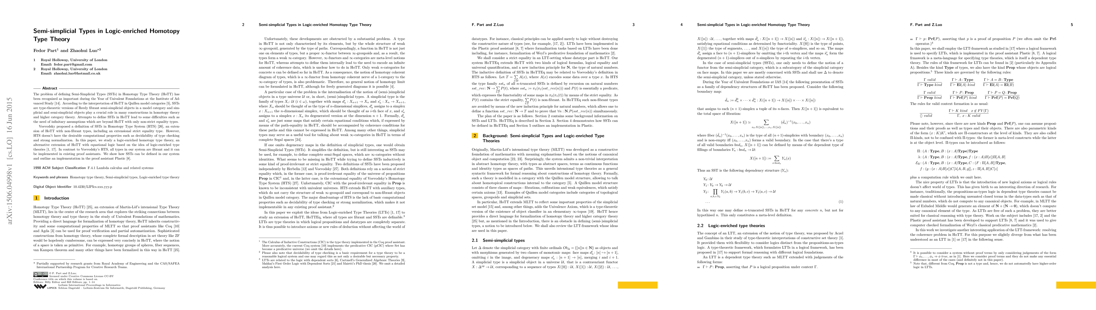 This paper proposes a logic-enriched extension of Homotopy Type Theory (HoTT) to define Semi-Simplicial Types (SSTs), addressing challenges in Voevodsky’s Homotopy Type System (HTS) by maintaining computational properties like decidability and strong normalization while ensuring all types remain fibrant. An implementation in the proof assistant Plastic is also outlined.