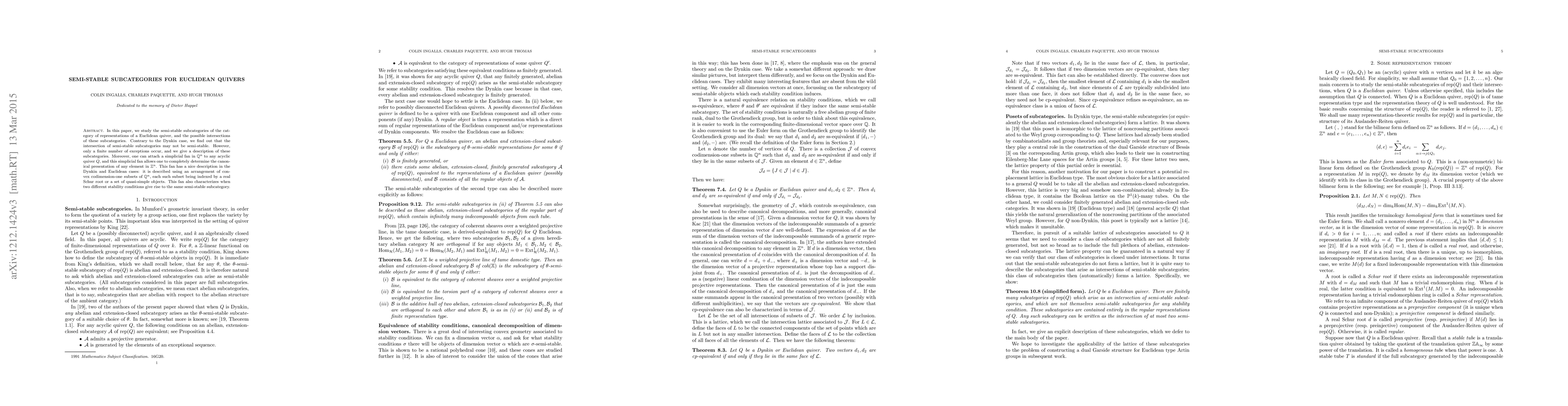This paper investigates semi-stable subcategories within Euclidean quiver representations, revealing that intersections may not be semi-stable except in a finite number of cases. It introduces a simplicial fan linked to acyclic quivers to determine canonical presentations and characterizes stability conditions resulting in identical subcategories.