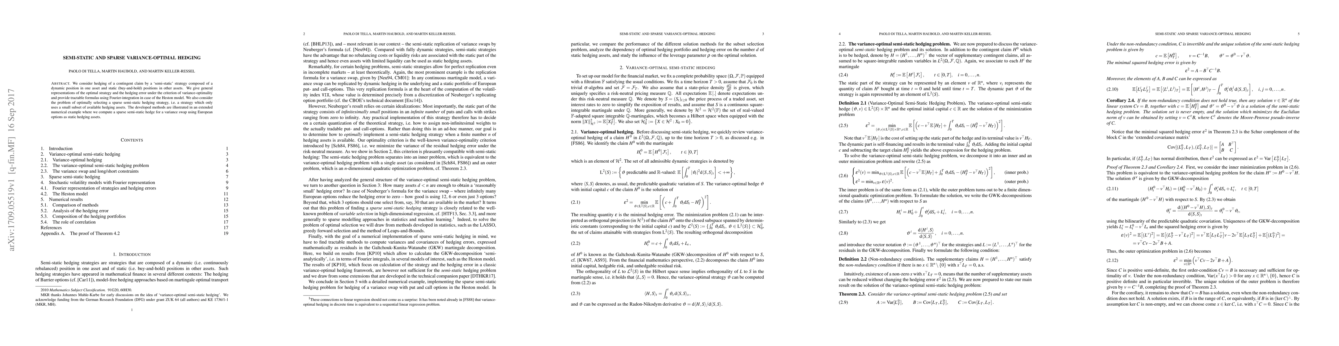 We consider hedging of a contingent claim by a 'semi-static' strategy composed of a dynamic position in one asset and static (buy-and-hold) positions in other assets. We give general representations of the optimal strategy and the hedging error under the criterion of variance-optimality and provide tractable formulas using Fourier-integration in case of the Heston model. We also consider the problem of optimally selecting a sparse semi-static hedging strategy, i.e. a strategy which only uses a small subset of available hedging assets. The developed methods are illustrated in an extended numerical example where we compute a sparse semi-static hedge for a variance swap using European options as static hedging assets.