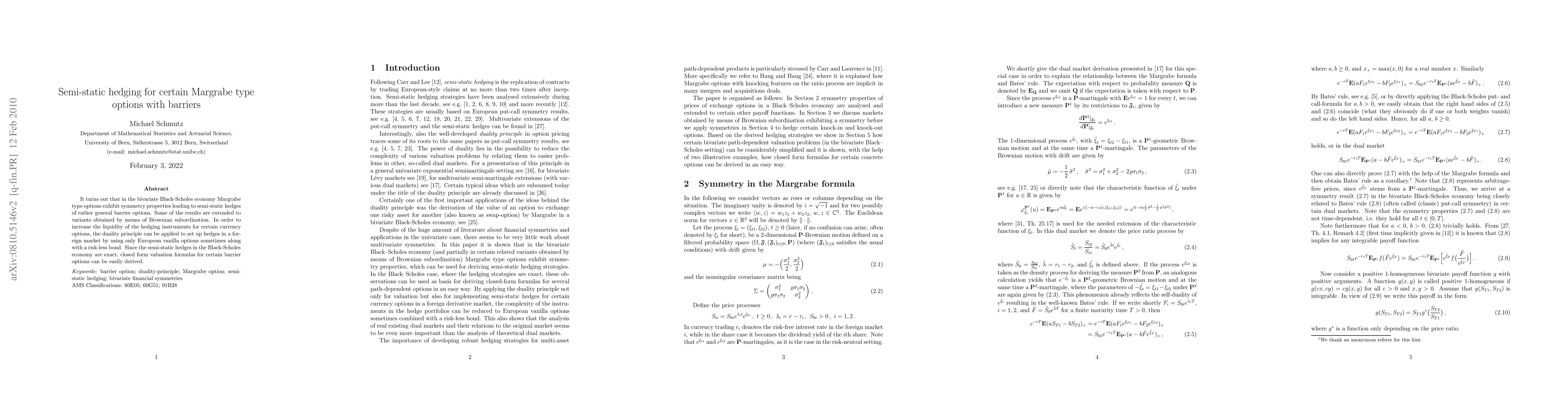 It turns out that in the bivariate Black-Scholes economy Margrabe type options exhibit symmetry properties leading to semi-static hedges of rather general barrier options. Some of the results are extended to variants obtained by means of Brownian subordination. In order to increase the liquidity of the hedging instruments for certain currency options, the duality principle can be applied to set up hedges in a foreign market by using only European vanilla options sometimes along with a risk-less bond. Since the semi-static hedges in the Black-Scholes economy are exact, closed form valuation formulas for certain barrier options can be easily derived.