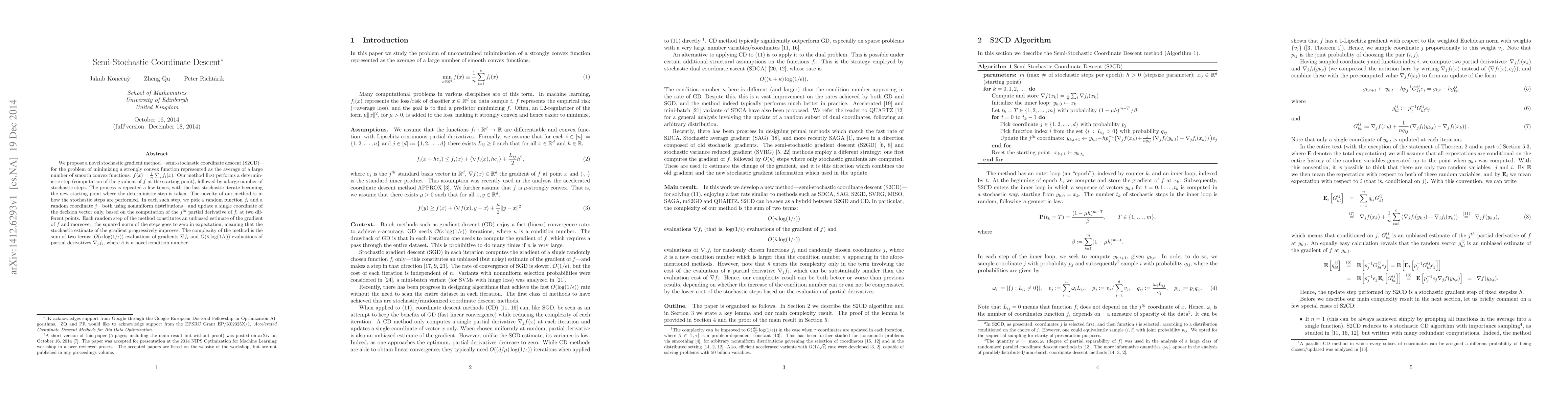 The paper introduces semi-stochastic coordinate descent (S2CD), a hybrid gradient method combining deterministic and stochastic steps for minimizing strongly convex functions. The method improves stochastic gradient estimates progressively, achieving complexity of $O(n\log(1/\epsilon))$ gradient evaluations and $O(\hat{\kappa}\log(1/\epsilon))$ partial derivative evaluations.