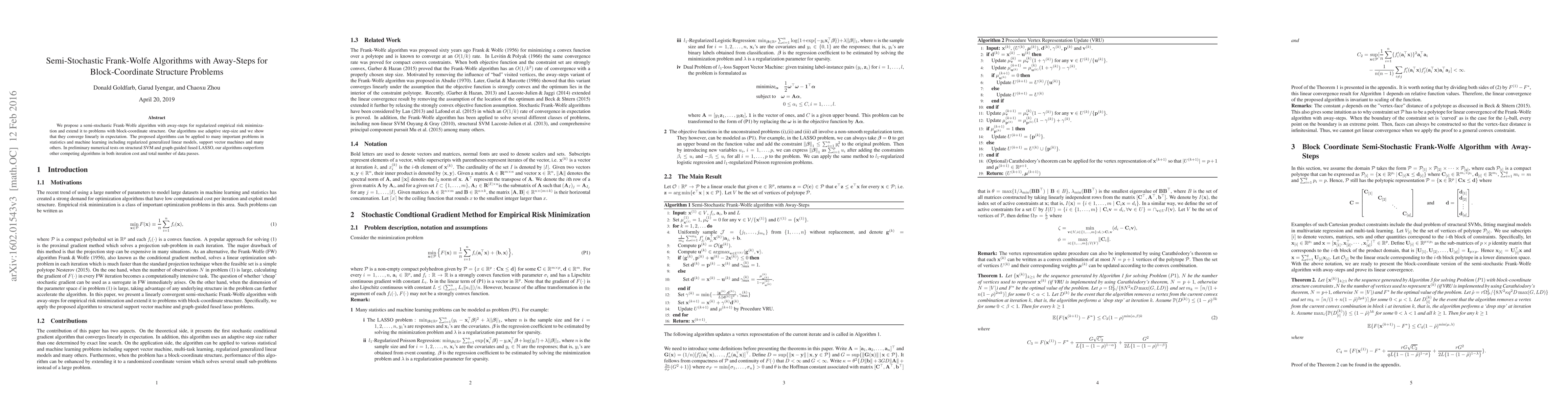 This paper introduces a semi-stochastic Frank-Wolfe algorithm with adaptive away-steps for block-coordinate optimization, demonstrating linear convergence. The method is shown to outperform competitors in empirical tests on structural SVM and graph-guided fused LASSO.