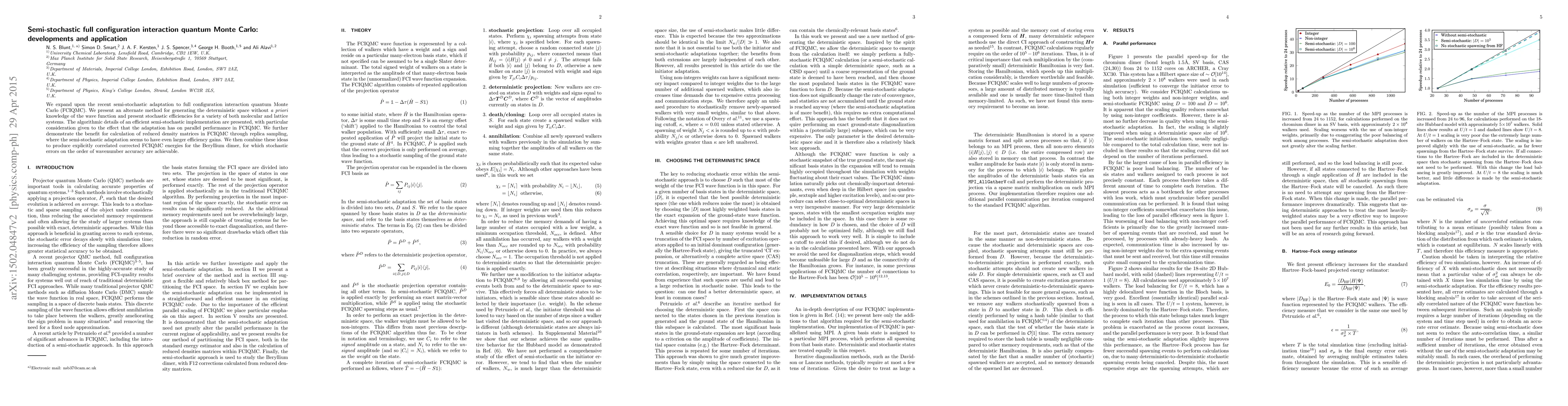 We expand upon the recent semi-stochastic adaptation to full configuration interaction quantum Monte Carlo (FCIQMC). We present an alternate method for generating the deterministic space without a priori knowledge of the wave function and present stochastic efficiencies for a variety of both molecular and lattice systems. The algorithmic details of an efficient semi-stochastic implementation are presented, with particular consideration given to the effect that the adaptation has on parallel performance in FCIQMC. We further demonstrate the benefit for calculation of reduced density matrices in FCIQMC through replica sampling, where the semi-stochastic adaptation seems to have even larger efficiency gains. We then combine these ideas to produce explicitly correlated corrected FCIQMC energies for the Beryllium dimer, for which stochastic errors on the order of wavenumber accuracy are achievable.