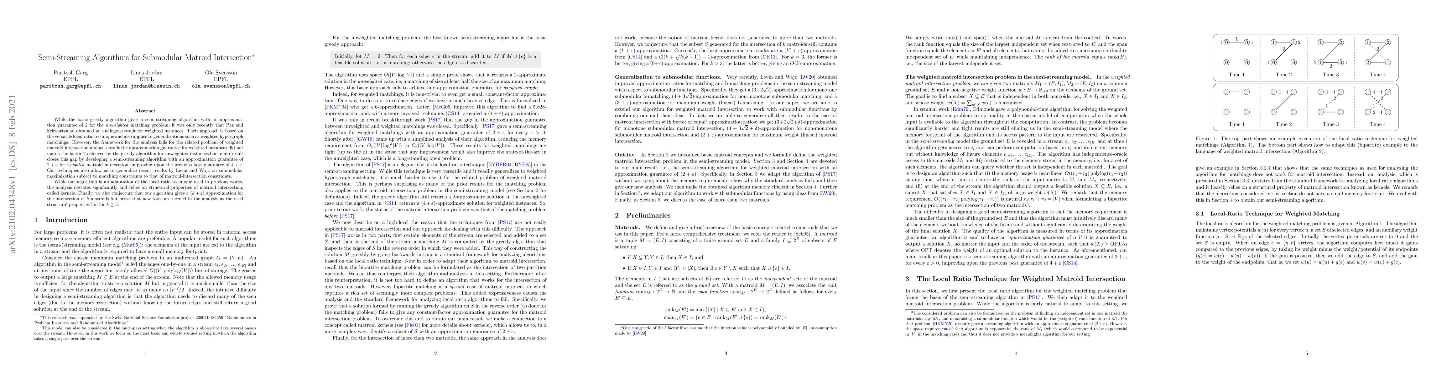 While the basic greedy algorithm gives a semi-streaming algorithm with an approximation guarantee of $2$ for the \emph{unweighted} matching problem, it was only recently that Paz and Schwartzman obtained an analogous result for weighted instances. Their approach is based on the versatile local ratio technique and also applies to generalizations such as weighted hypergraph matchings. However, the framework for the analysis fails for the related problem of weighted matroid intersection and as a result the approximation guarantee for weighted instances did not match the factor $2$ achieved by the greedy algorithm for unweighted instances. Our main result closes this gap by developing a semi-streaming algorithm with an approximation guarantee of $2+\epsilon$ for \emph{weighted} matroid intersection, improving upon the previous best guarantee of $4+\epsilon$. Our techniques also allow us to generalize recent results by Levin and Wajc on submodular maximization subject to matching constraints to that of matroid-intersection constraints. While our algorithm is an adaptation of the local ratio technique used in previous works, the analysis deviates significantly and relies on structural properties of matroid intersection, called kernels. Finally, we also conjecture that our algorithm gives a $(k+\epsilon)$ approximation for the intersection of $k$ matroids but prove that new tools are needed in the analysis as the used structural properties fail for $k\geq 3$.