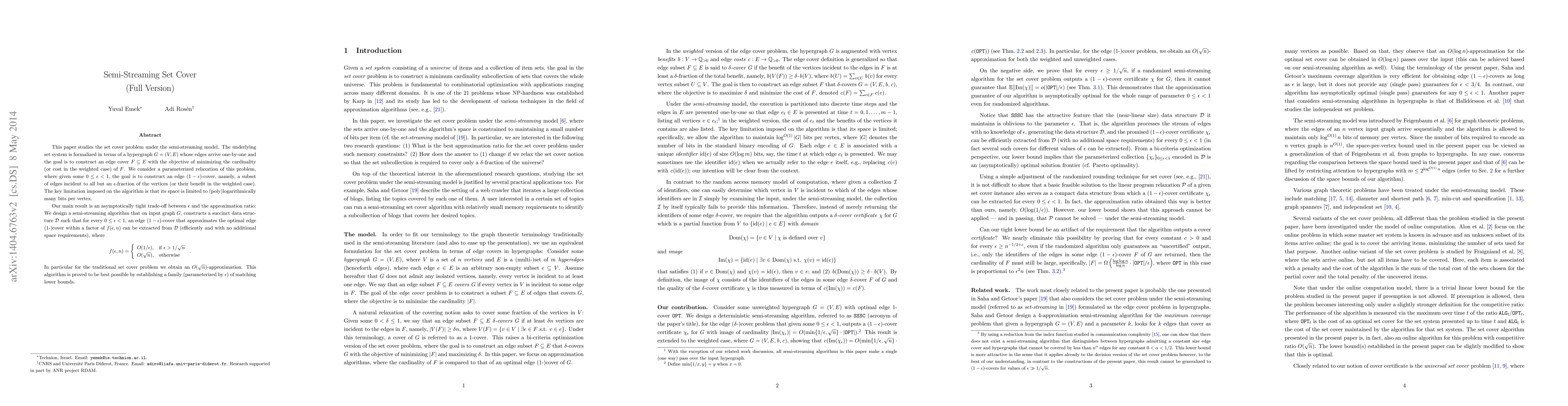 This paper presents a semi-streaming algorithm for the set cover problem under a hypergraph model, achieving an asymptotically tight trade-off between the approximation ratio and the parameter $\epsilon$. The algorithm constructs a data structure that extracts an $(1 - \epsilon)$-cover with an approximation factor of $O(1/\epsilon)$ or $O(\sqrt{n})$, depending on $\epsilon$.