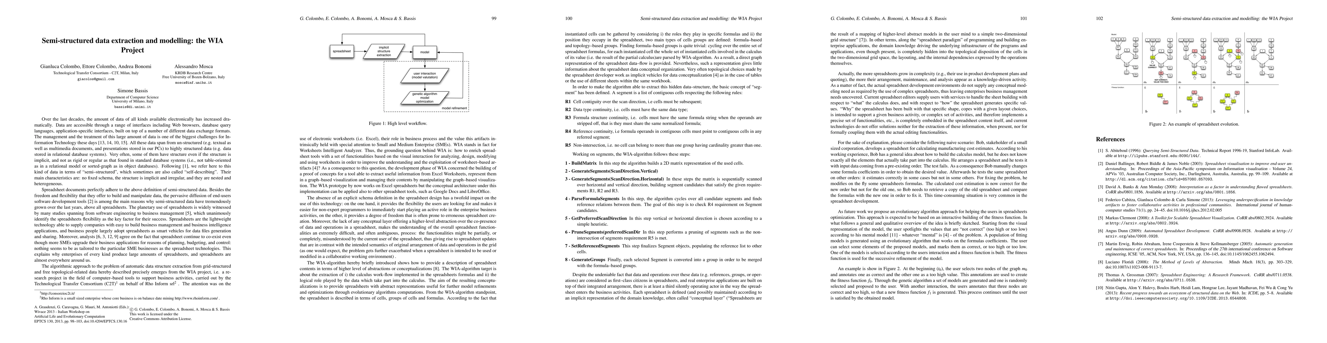 Over the last decades, the amount of data of all kinds available electronically has increased dramatically. Data are accessible through a range of interfaces including Web browsers, database query languages, application-specific interfaces, built on top of a number of different data exchange formats. All these data span from un-structured to highly structured data. Very often, some of them have structure even if the structure is implicit, and not as rigid or regular as that found in standard database systems. Spreadsheet documents are prototypical in this respect. Spreadsheets are the lightweight technology able to supply companies with easy to build business management and business intelligence applications, and business people largely adopt spreadsheets as smart vehicles for data files generation and sharing. Actually, the more spreadsheets grow in complexity (e.g., their use in product development plans and quoting), the more their arrangement, maintenance, and analysis appear as a knowledge-driven activity. The algorithmic approach to the problem of automatic data structure extraction from spreadsheet documents (i.e., grid-structured and free topological-related data) emerges from the WIA project: Worksheets Intelligent Analyser. The WIA-algorithm shows how to provide a description of spreadsheet contents in terms of higher level of abstractions or conceptualisations. In particular, the WIA-algorithm target is about the extraction of i) the calculus work-flow implemented in the spreadsheets formulas and ii) the logical role played by the data which take part into the calculus. The aim of the resulting conceptualisations is to provide spreadsheets with abstract representations useful for further model refinements and optimizations through evolutionary algorithms computations.