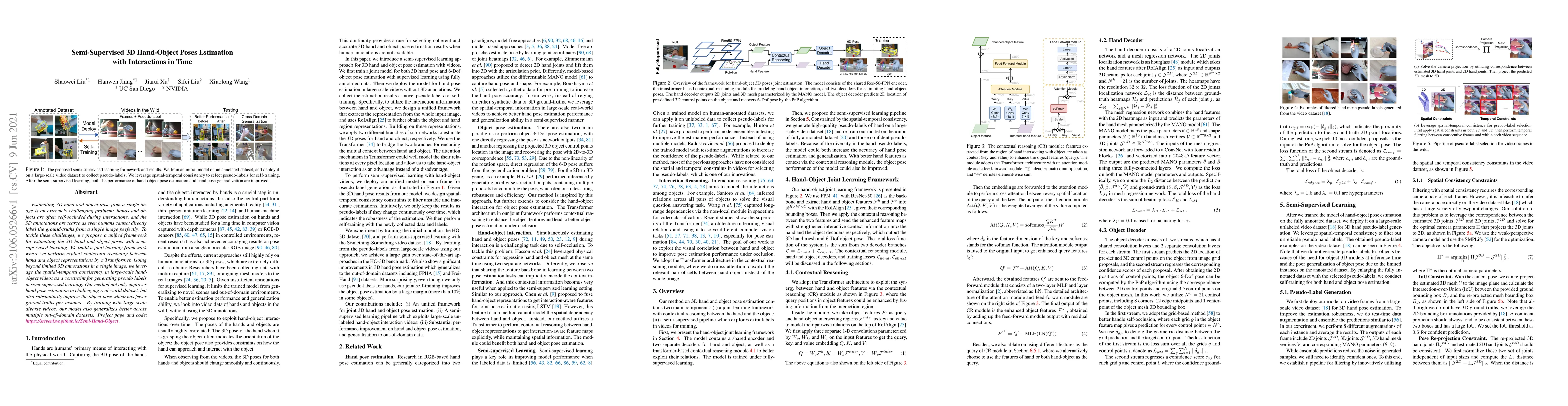 This paper proposes a semi-supervised framework for estimating 3D hand and object poses from single images, leveraging spatial-temporal consistency in hand-object videos to generate pseudo labels. The method uses a Transformer for contextual reasoning and shows improved performance on challenging real-world datasets and better generalization across different domains.