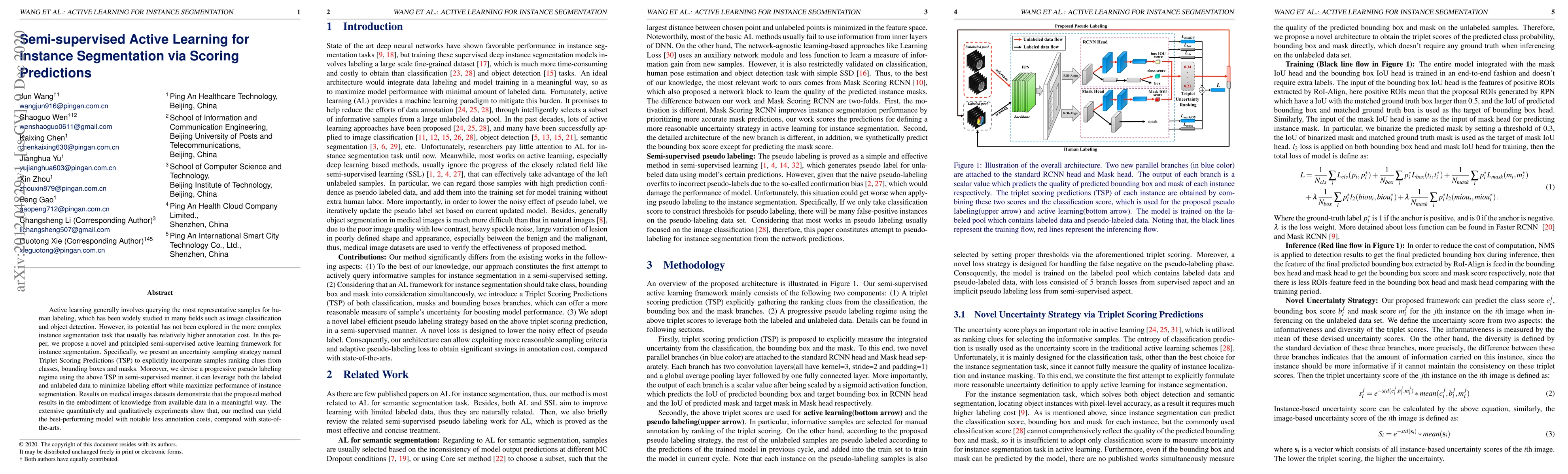 This paper proposes a semi-supervised active learning framework for instance segmentation using a Triplet Scoring Predictions (TSP) strategy that ranks samples based on class, bounding box, and mask uncertainty. The method employs a progressive pseudo labeling regime to leverage both labeled and unlabeled data, achieving high performance with reduced annotation costs.