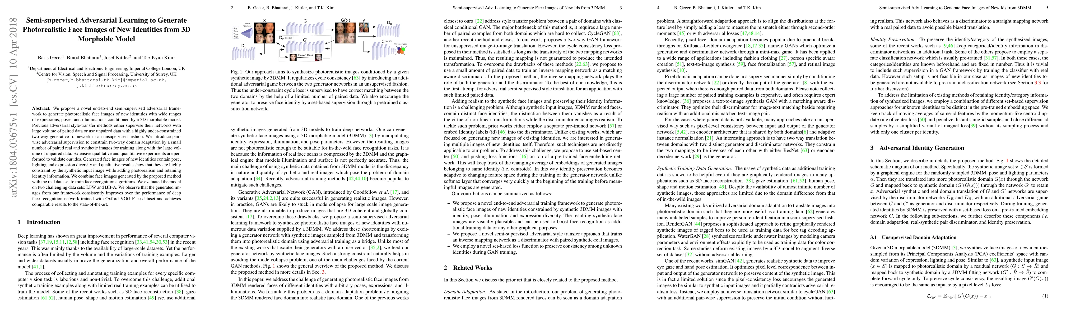 The paper proposes a semi-supervised adversarial framework for generating photorealistic face images of new identities using a 3D Morphable Model (3DMM). It introduces pairwise adversarial supervision to constrain domain adaptation with a small number of paired real and synthetic images, alongside large volumes of unpaired data.