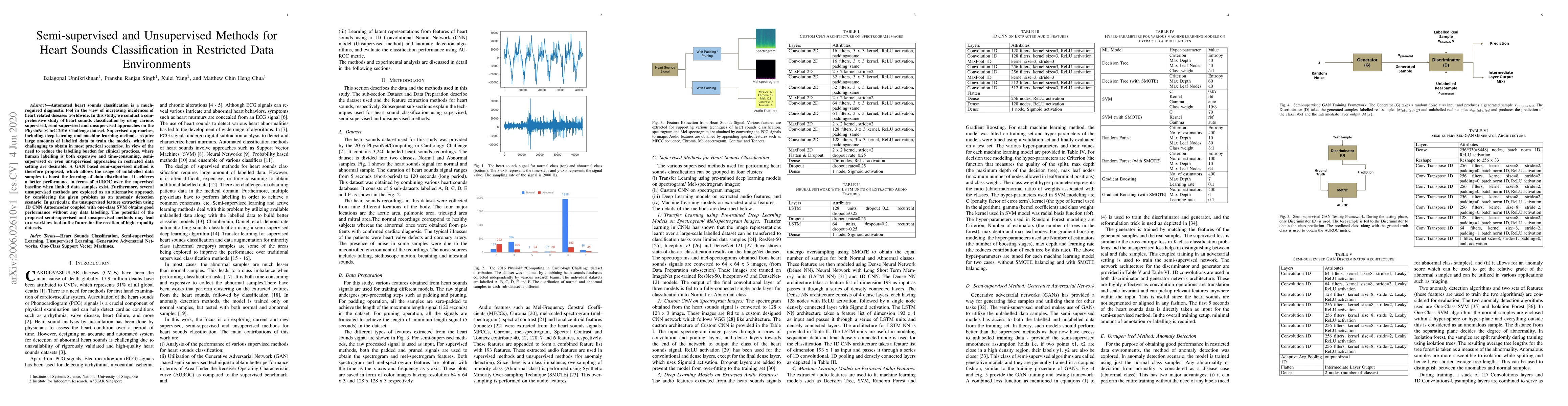 This paper explores semi-supervised and unsupervised methods for classifying heart sounds using the PhysioNet/CinC 2016 dataset, aiming to reduce the reliance on large amounts of labelled data. A GAN-based semi-supervised approach and unsupervised 1D CNN Autoencoder with one-class SVM show promising results, potentially offering practical diagnostic tools in restricted data environments.
