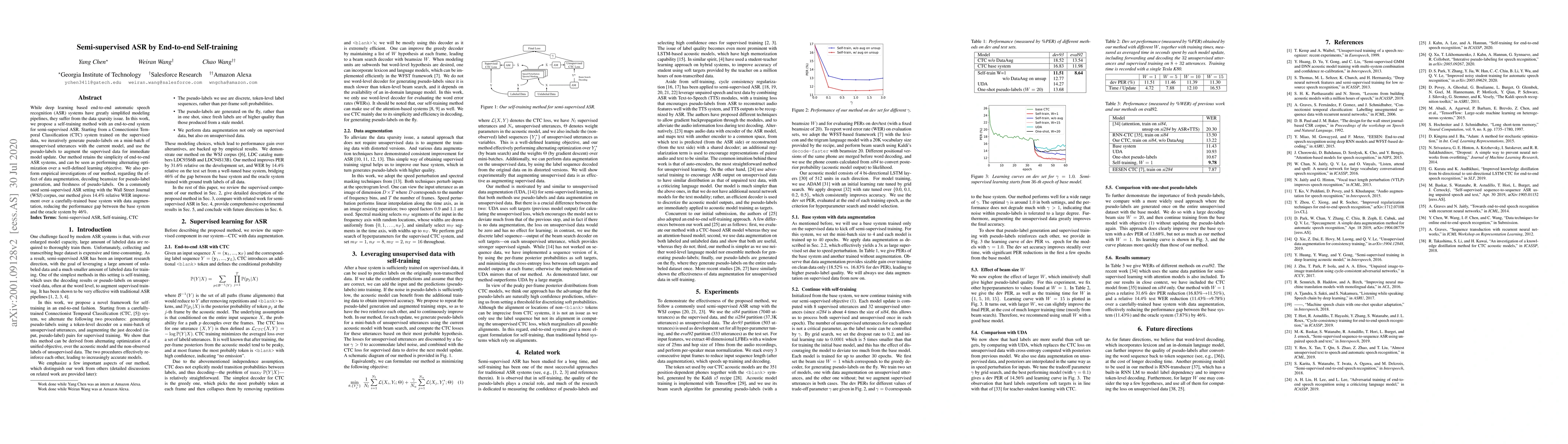 This paper proposes a self-training method for semi-supervised end-to-end ASR that iteratively generates pseudo-labels to augment supervised data, improving performance by 14.4% relative WER on the WSJ corpus. The method maintains the simplicity of end-to-end ASR systems while effectively reducing the performance gap to an oracle system.