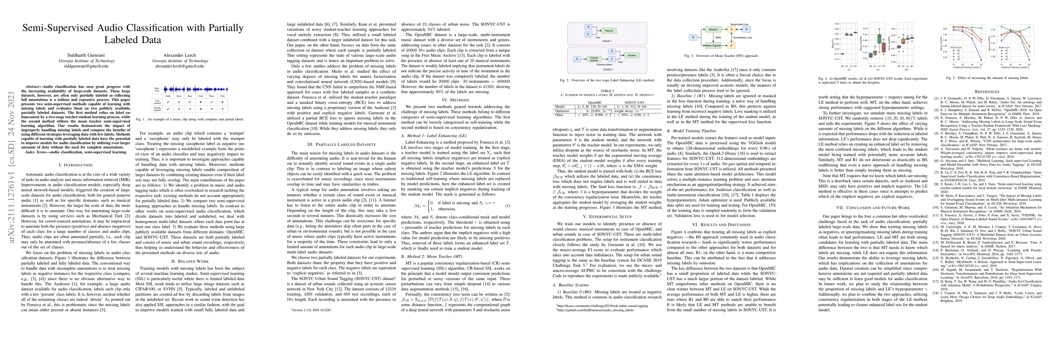 This paper introduces two semi-supervised methods for audio classification using partially labeled data, evaluating them on two datasets. The first method employs label enhancement through a teacher-student learning process, while the second uses mean teacher semi-supervised learning. The study highlights the importance of handling missing labels and the benefits of different strategies for leveraging unlabeled data.