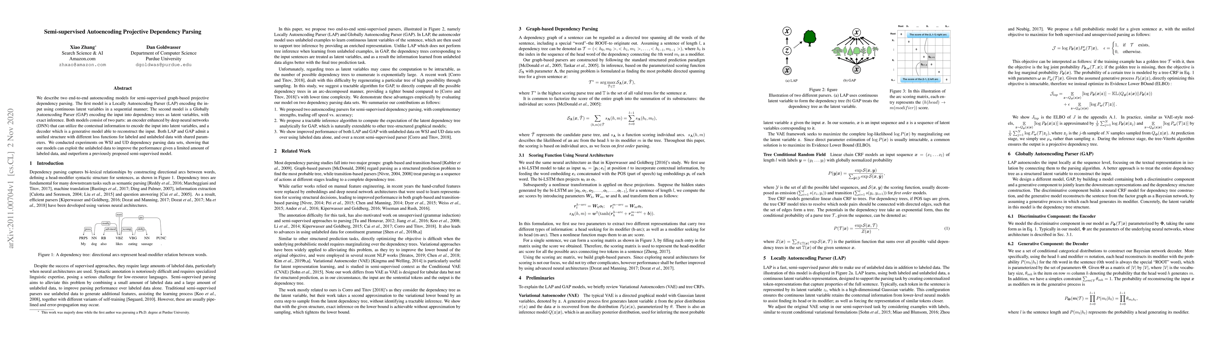 This paper presents two autoencoding models for semi-supervised projective dependency parsing: a Locally Autoencoding Parser (LAP) and a Globally Autoencoding Parser (GAP). Both models utilize deep neural networks for encoding contextual information and generative models for reconstruction, achieving better performance using unlabeled data to supplement limited labeled data.