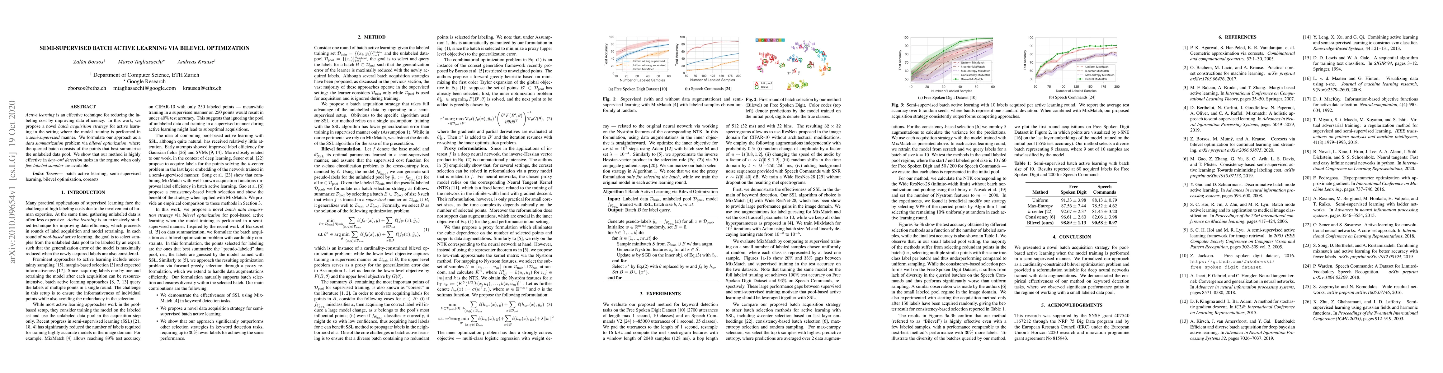 This paper introduces a novel semi-supervised batch active learning method using bilevel optimization to minimize labeling costs. The proposed approach selects batches that best summarize unlabeled data, demonstrating effectiveness in keyword detection with limited labeled samples.
