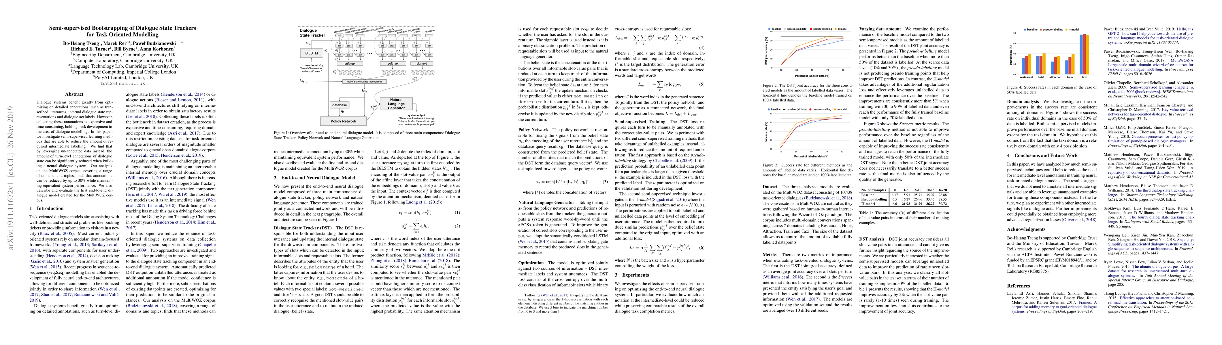 Dialogue systems benefit greatly from optimizing on detailed annotations, such as transcribed utterances, internal dialogue state representations and dialogue act labels. However, collecting these annotations is expensive and time-consuming, holding back development in the area of dialogue modelling. In this paper, we investigate semi-supervised learning methods that are able to reduce the amount of required intermediate labelling. We find that by leveraging un-annotated data instead, the amount of turn-level annotations of dialogue state can be significantly reduced when building a neural dialogue system. Our analysis on the MultiWOZ corpus, covering a range of domains and topics, finds that annotations can be reduced by up to 30\% while maintaining equivalent system performance. We also describe and evaluate the first end-to-end dialogue model created for the MultiWOZ corpus.