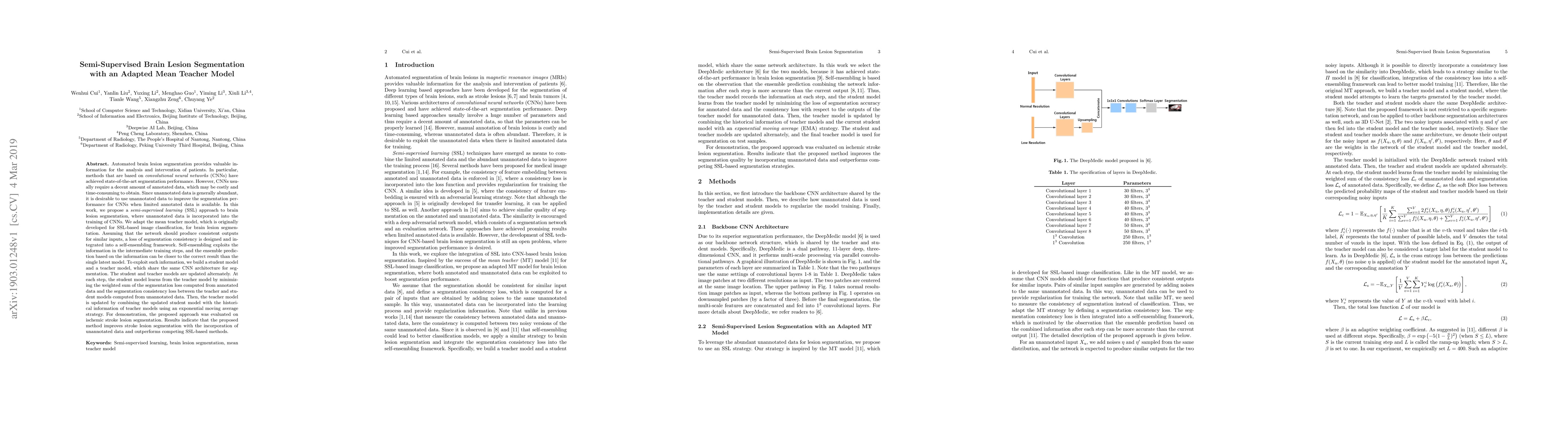 This research proposes a semi-supervised learning approach for brain lesion segmentation using an adapted mean teacher model. It leverages unannotated data to improve CNN performance when annotated data is limited, demonstrating improved segmentation of ischemic stroke lesions.