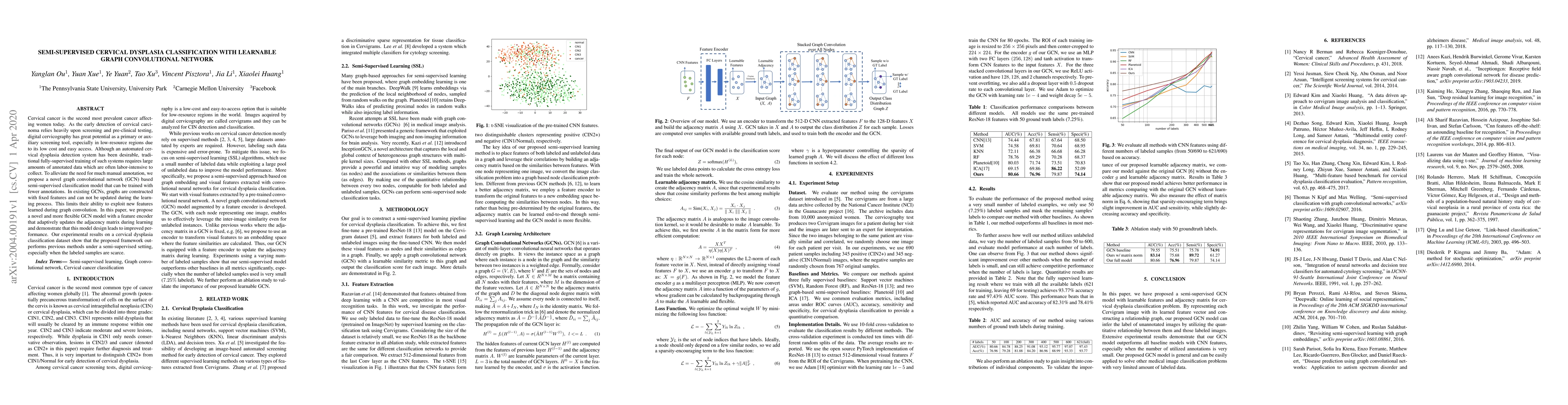 This paper proposes a semi-supervised graph convolutional network (GCN) for cervical dysplasia classification that adaptively updates the adjacency matrix during training, requiring fewer labeled samples. The model outperforms previous methods, especially in low-resource settings with limited annotated data.