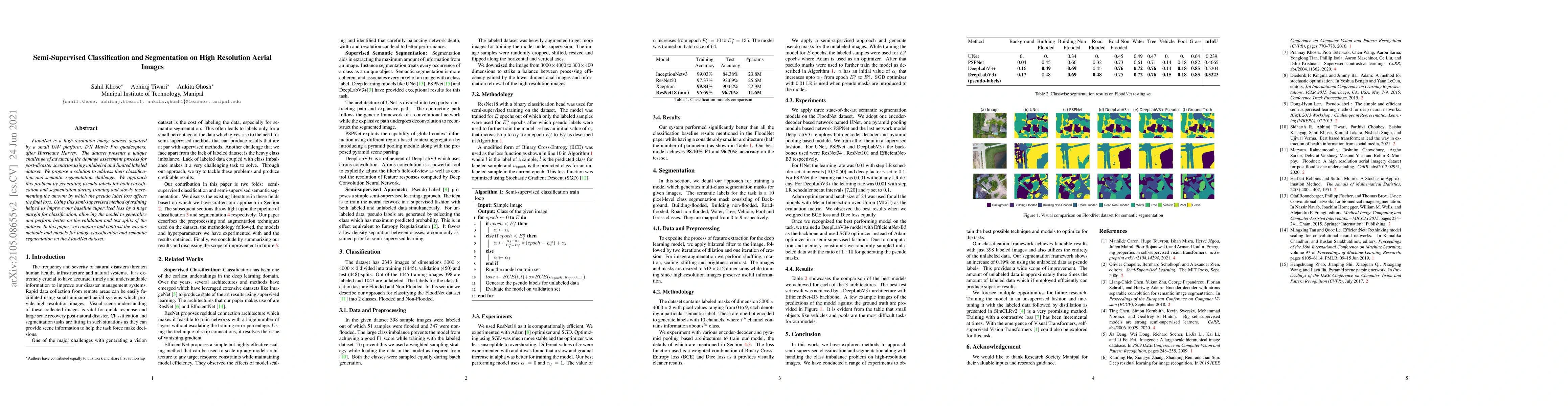 FloodNet is a high-resolution image dataset acquired by a small UAV platform, DJI Mavic Pro quadcopters, after Hurricane Harvey. The dataset presents a unique challenge of advancing the damage assessment process for post-disaster scenarios using unlabeled and limited labeled dataset. We propose a solution to address their classification and semantic segmentation challenge. We approach this problem by generating pseudo labels for both classification and segmentation during training and slowly incrementing the amount by which the pseudo label loss affects the final loss. Using this semi-supervised method of training helped us improve our baseline supervised loss by a huge margin for classification, allowing the model to generalize and perform better on the validation and test splits of the dataset. In this paper, we compare and contrast the various methods and models for image classification and semantic segmentation on the FloodNet dataset.