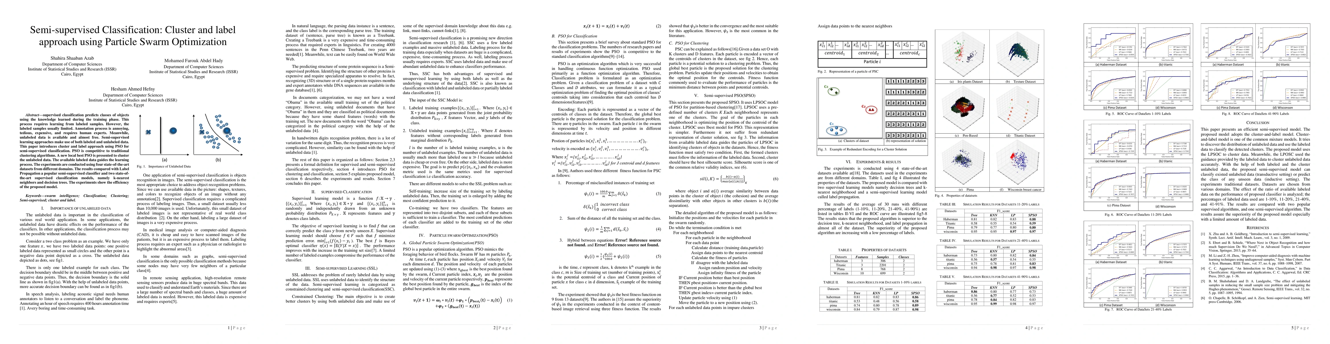 This paper proposes a semi-supervised classification method using Particle Swarm Optimization (PSO) to cluster and label data. The approach leverages both labeled and abundant unlabeled data, demonstrating competitive performance compared to Label Propagation and supervised models like k-nearest neighbors and decision trees.