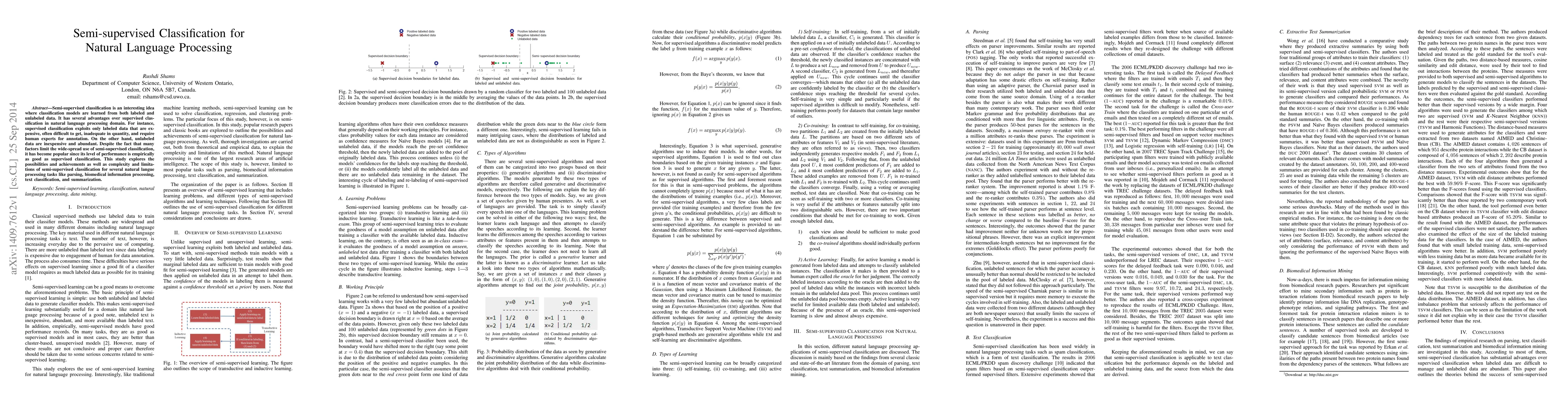 This research examines semi-supervised classification in natural language processing, leveraging both labeled and unlabeled data to overcome the limitations of supervised methods reliant on costly and scarce labeled data. Despite challenges, semi-supervised approaches show comparable performance, with applications in parsing, biomedical information processing, text classification, and summarization.