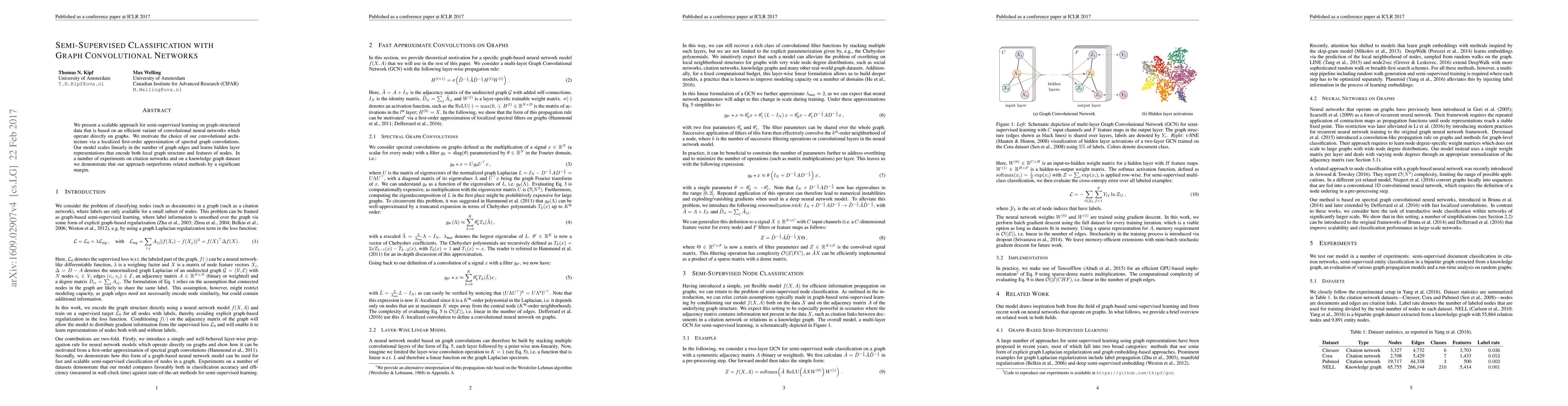 We present a scalable approach for semi-supervised learning on graph-structured data that is based on an efficient variant of convolutional neural networks which operate directly on graphs. We motivate the choice of our convolutional architecture via a localized first-order approximation of spectral graph convolutions. Our model scales linearly in the number of graph edges and learns hidden layer representations that encode both local graph structure and features of nodes. In a number of experiments on citation networks and on a knowledge graph dataset we demonstrate that our approach outperforms related methods by a significant margin.