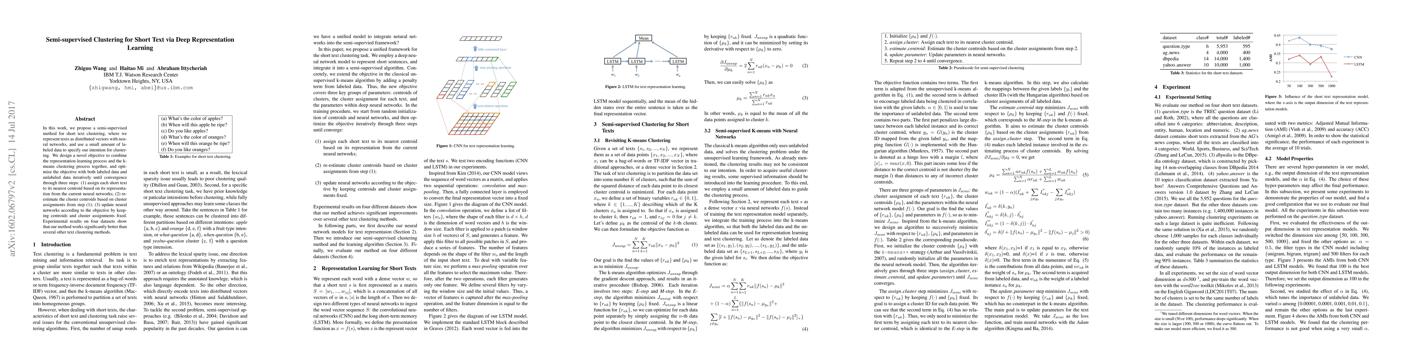 This paper proposes a semi-supervised clustering method for short texts using deep representation learning, combining neural network-based text representations with k-means clustering. The method iteratively optimizes the objective function using both labeled and unlabeled data, achieving superior performance compared to other clustering techniques.