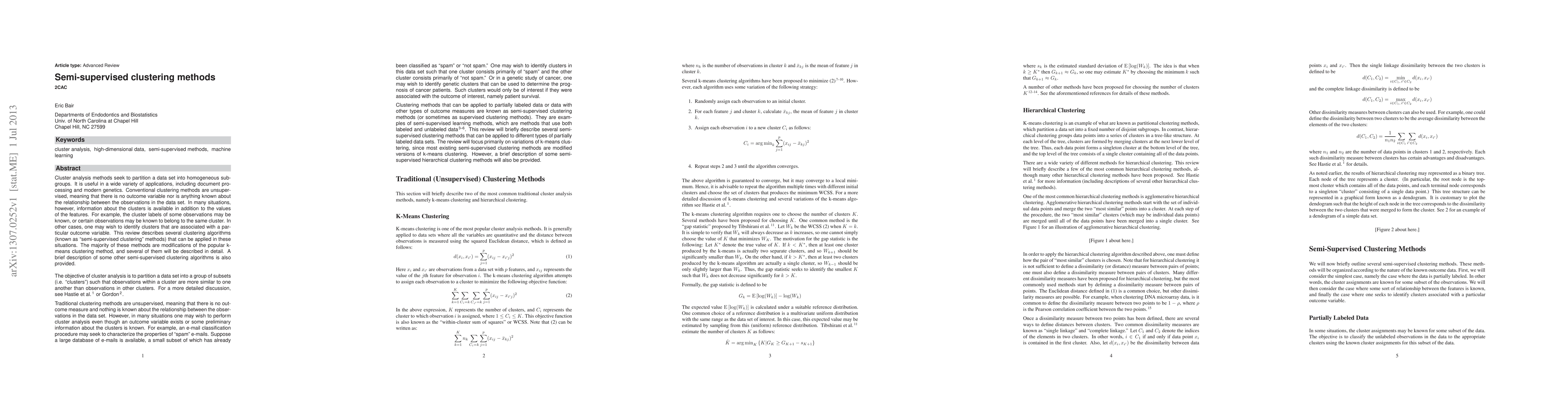 This paper reviews semi-supervised clustering methods that leverage both labeled and unlabeled data to improve cluster analysis. It focuses on modifications of the k-means algorithm and briefly describes other related techniques.