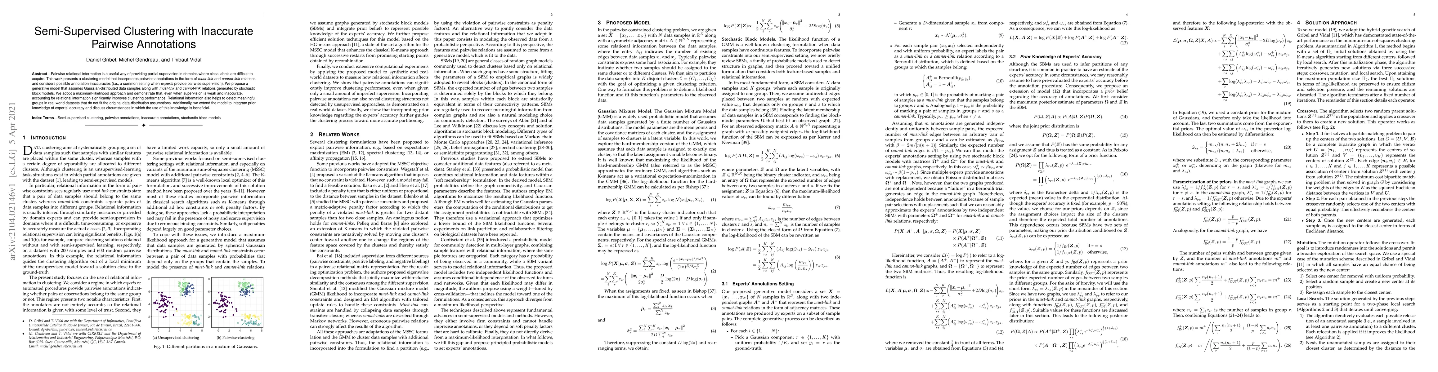 This paper proposes a semi-supervised clustering model that leverages pairwise annotations (must-link and cannot-link relations) to improve clustering despite annotation inaccuracies. The model incorporates a generative approach with Gaussian-distributed data and stochastic block models, demonstrating enhanced performance even with weak and inaccurate supervision.