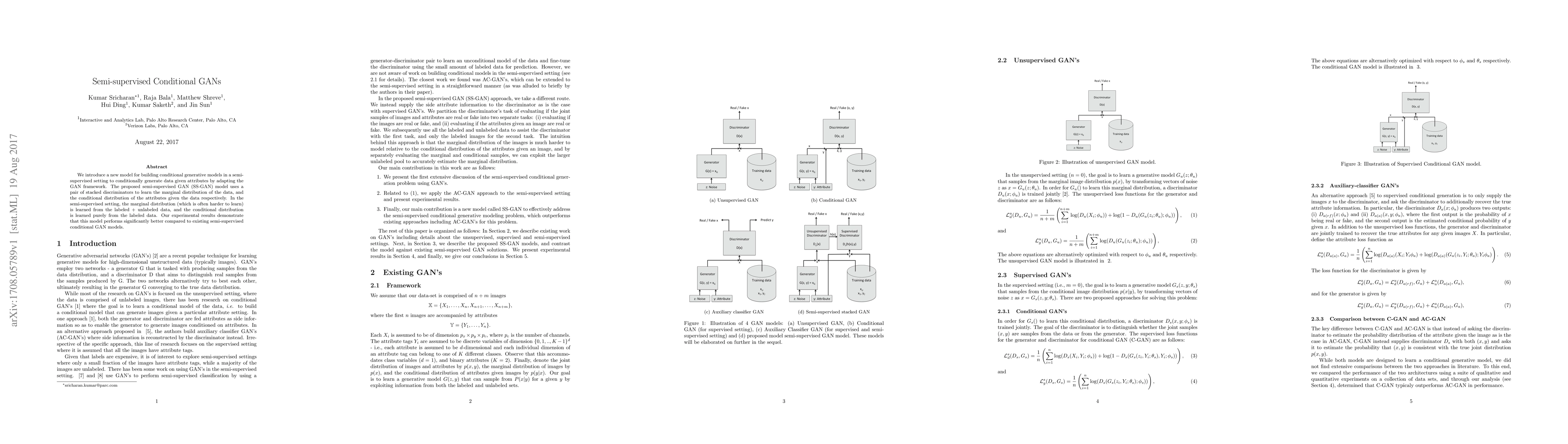 This paper proposes a semi-supervised GAN (SS-GAN) model that uses stacked discriminators to learn both the marginal and conditional distributions of data and attributes. The model shows superior performance compared to existing models in semi-supervised conditional GAN frameworks.