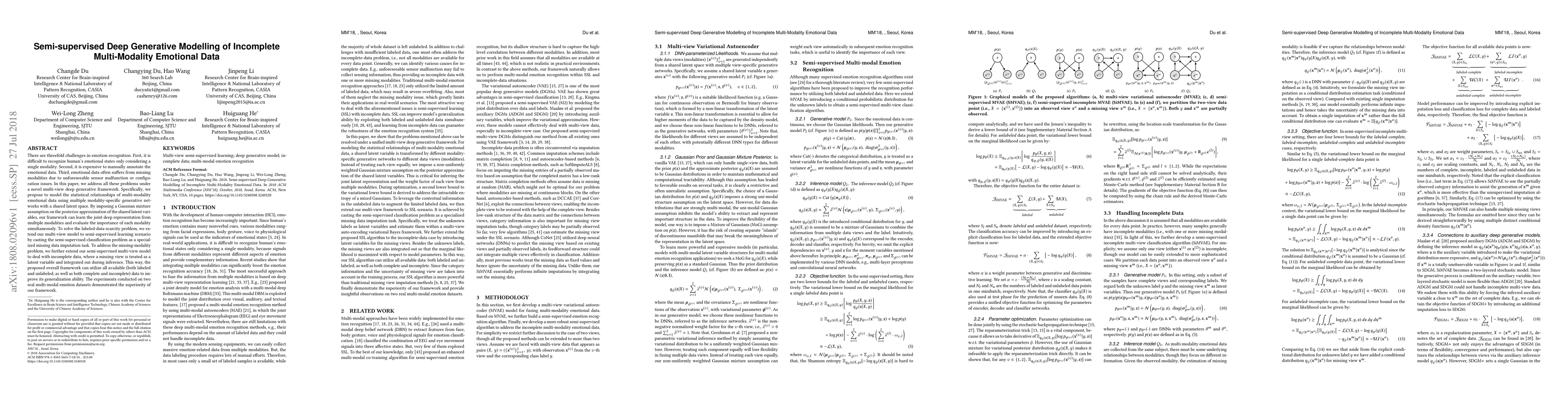 This paper proposes a novel multi-view deep generative framework to address challenges in emotion recognition, including the difficulty of single-modality analysis, high annotation costs, and missing modalities. The framework models multi-modality emotional data using multiple generative networks with a shared latent space, and extends it to semi-supervised learning to utilize scarce labeled data and incomplete data scenarios. Experiments on real datasets show the framework's effectiveness.