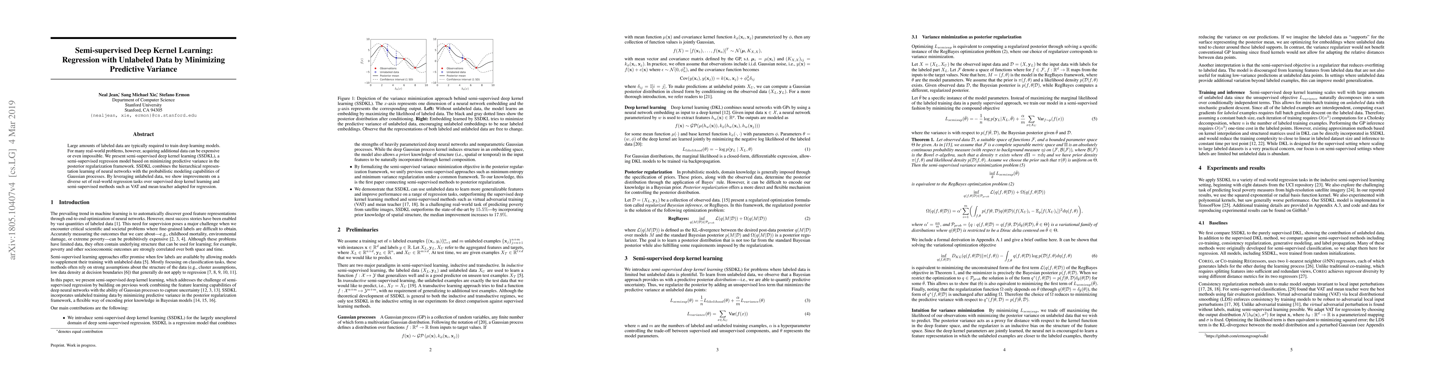 This paper introduces semi-supervised deep kernel learning (SSDKL), a regression model that utilizes unlabeled data to improve performance by minimizing predictive variance. Combining neural networks' hierarchical representation learning with Gaussian processes' probabilistic modeling, SSDKL outperforms supervised methods and other semi-supervised techniques on various real-world regression tasks.