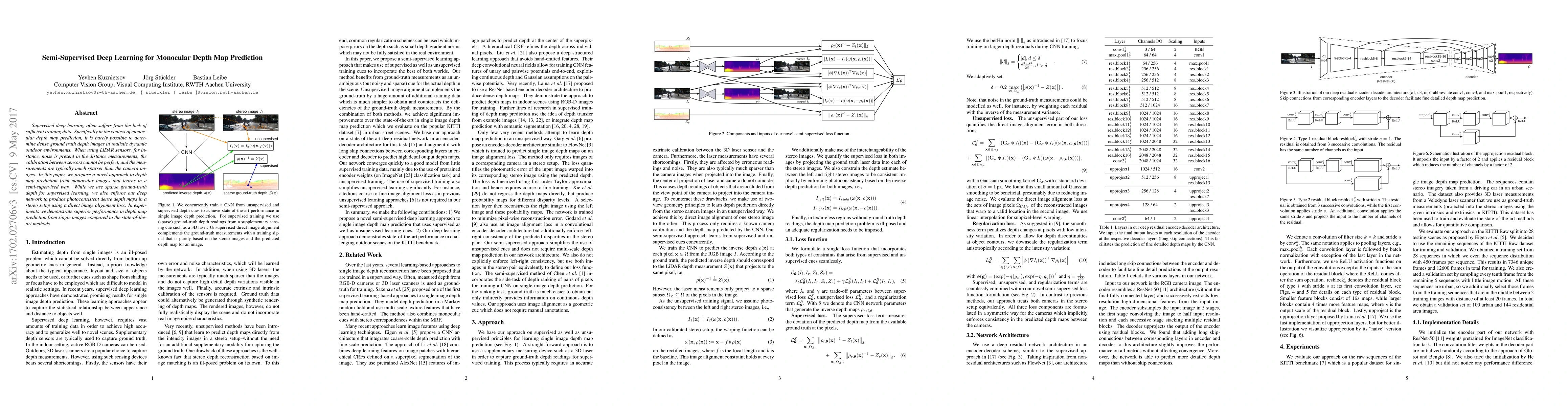 This paper presents a semi-supervised deep learning method for predicting monocular depth maps, addressing the scarcity of dense ground truth data. It combines sparse supervised learning with photoconsistent dense depth map production in a stereo setup, achieving superior depth prediction performance compared to existing methods.