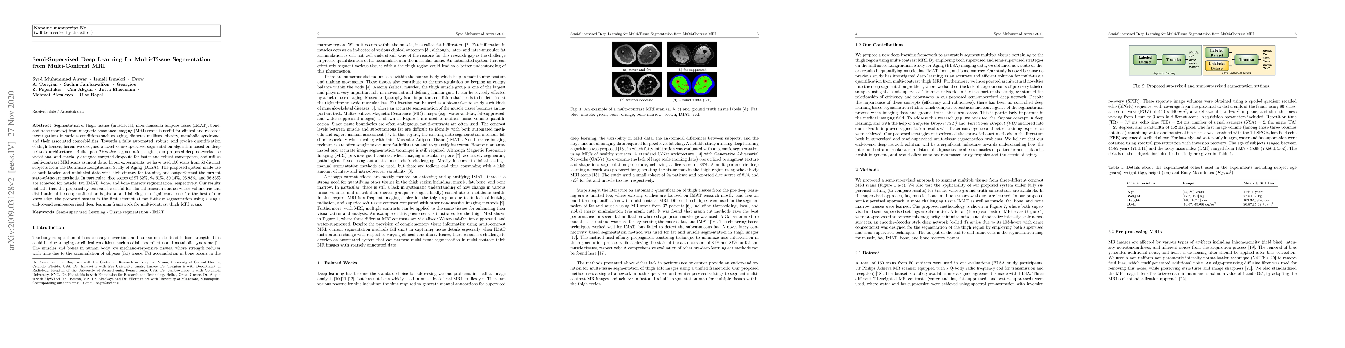 This paper proposes a novel semi-supervised deep learning algorithm for segmenting multiple thigh tissues from multi-contrast MRI scans, achieving high accuracy and outperforming existing methods. The system leverages both labeled and unlabeled data, demonstrating significant potential for clinical research applications.