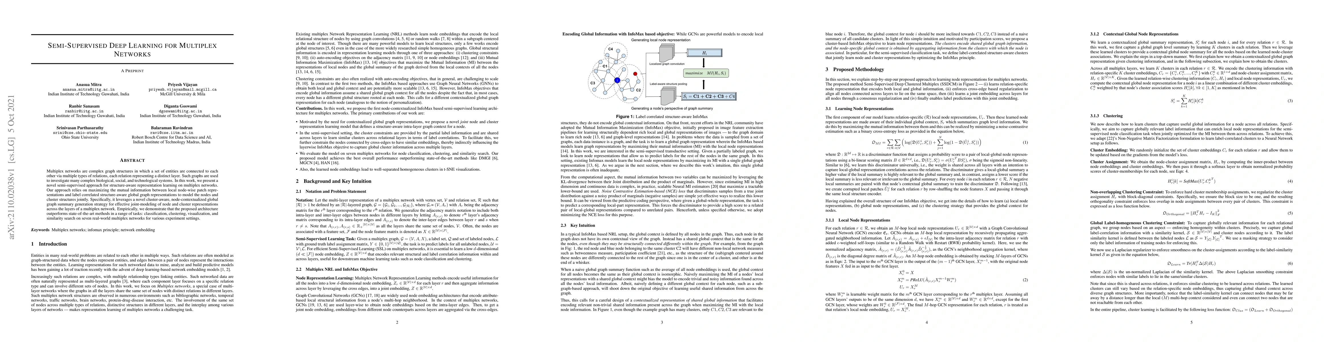 This paper introduces a semi-supervised deep learning method for learning representations on multiplex networks, which are complex graphs with multiple relation types. The proposed approach maximizes mutual information between local node representations and global graph representations to model nodes and cluster structures jointly, achieving superior performance on classification, clustering, visualization, and similarity search tasks.