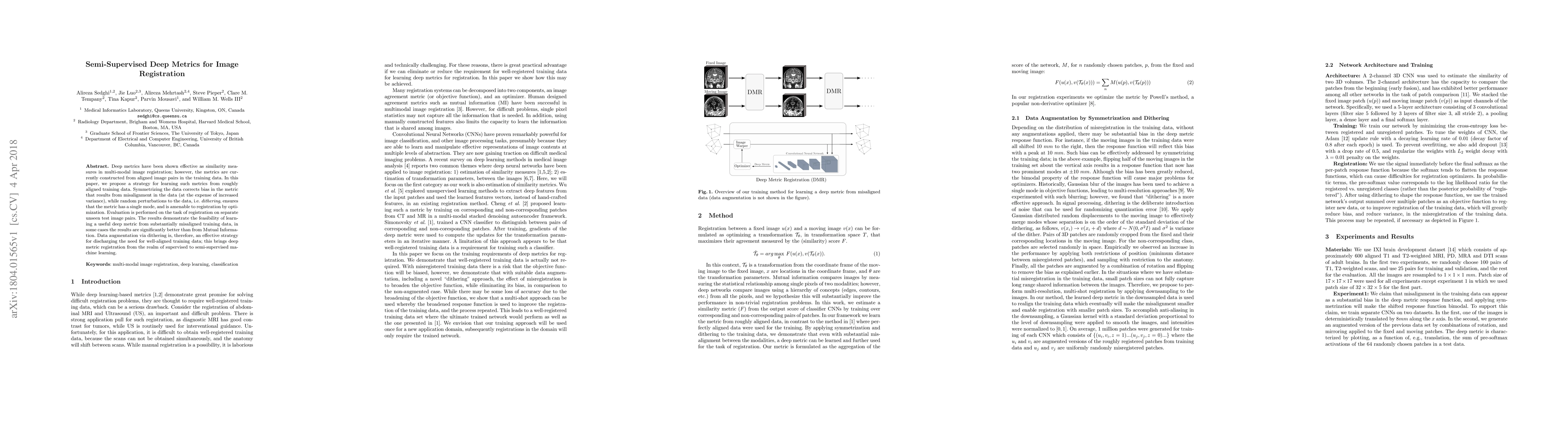 This research introduces a semi-supervised method for learning deep metrics in image registration using roughly aligned training data. By symmetrizing data and applying random perturbations (dithering), the method corrects bias and ensures a single mode, outperforming Mutual Information in some cases. This approach moves deep metric registration from supervised to semi-supervised learning, reducing the need for well-aligned training data.