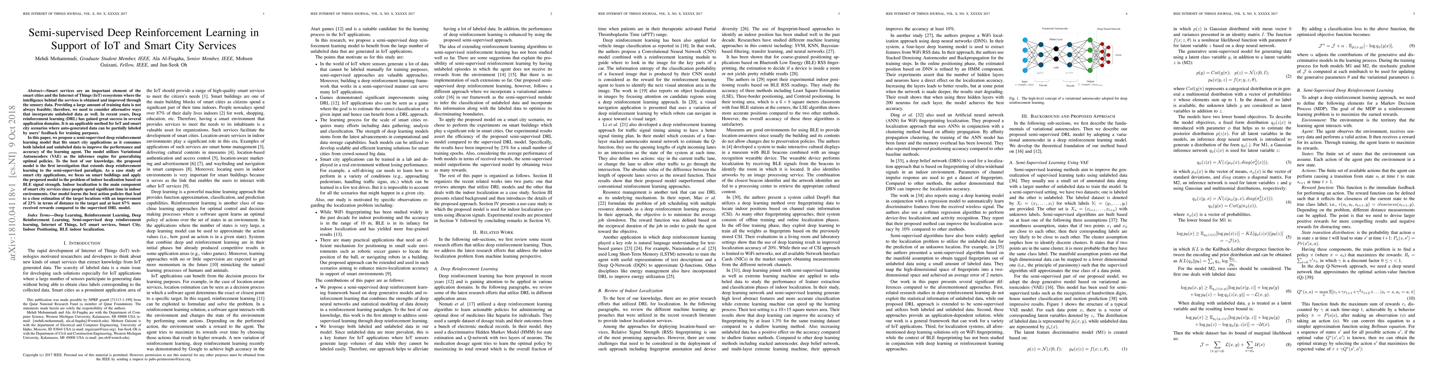 This paper proposes a semi-supervised deep reinforcement learning model that leverages both labeled and unlabeled data to enhance smart city services, particularly indoor localization using BLE signal strength. The model employs Variational Autoencoders to generalize optimal policies, achieving a 23% improvement in target location estimation and 67% more rewards compared to supervised DRL.