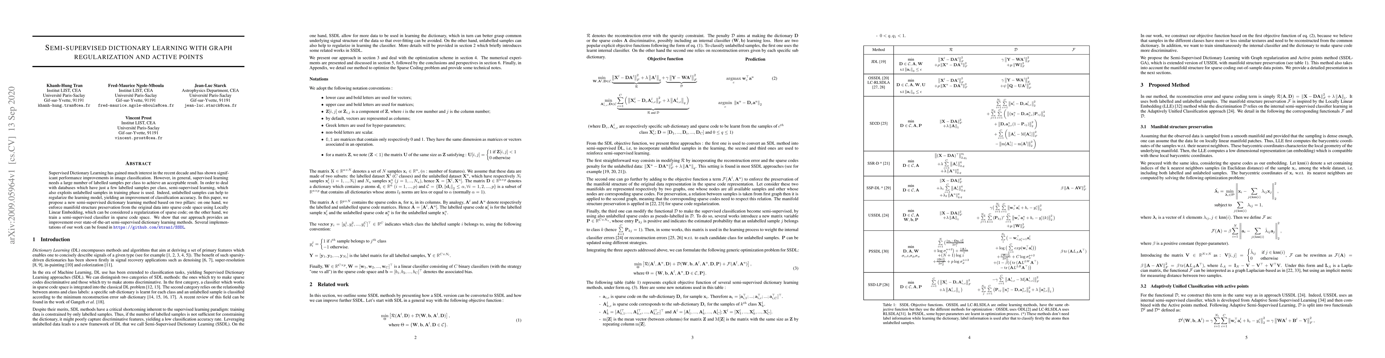 This paper proposes a new semi-supervised dictionary learning method that leverages graph regularization and active points to improve classification accuracy. It combines manifold structure preservation using Locally Linear Embedding and a semi-supervised classifier in sparse code space, demonstrating superior performance over existing methods.