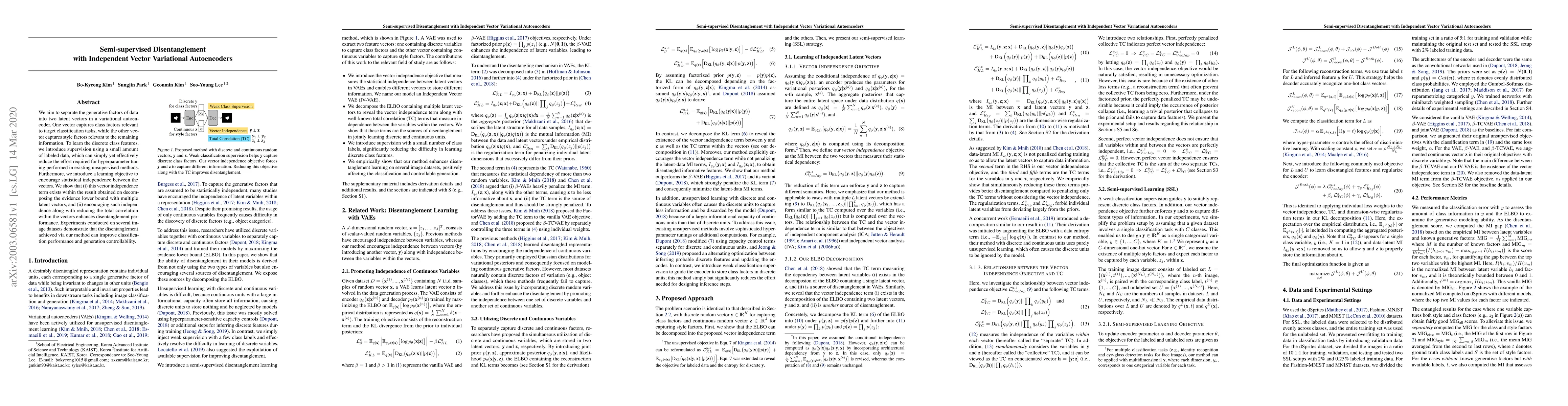 This paper proposes a semi-supervised variational autoencoder that disentangles data into class and style factors using independent vector learning. The method leverages a small amount of labeled data to improve classification and generation controllability, demonstrating enhanced disentanglement performance through statistical independence between latent vectors.