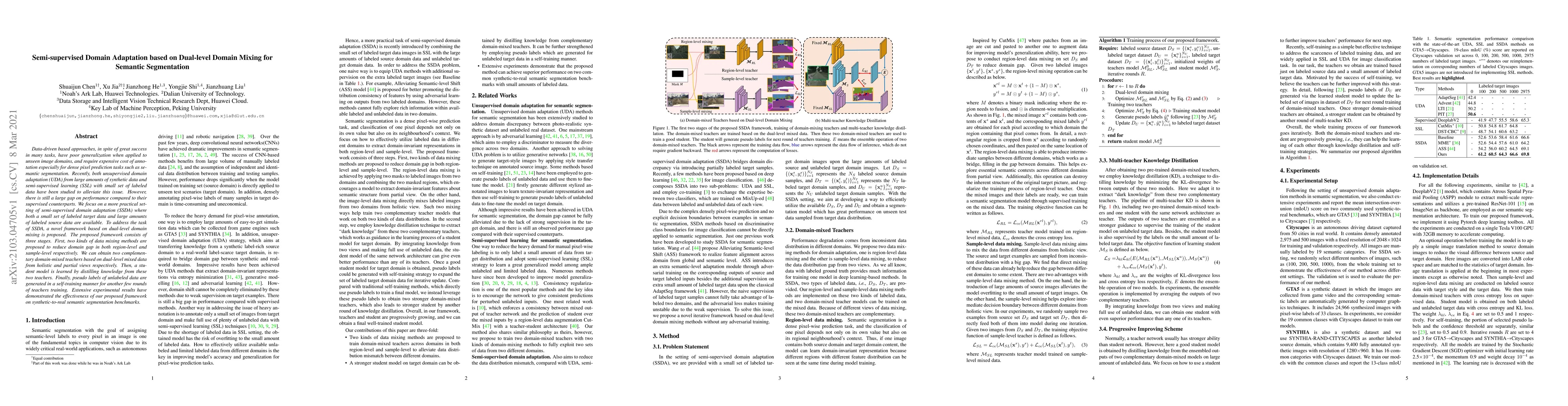 This paper proposes a semi-supervised domain adaptation framework based on dual-level domain mixing to improve semantic segmentation. The framework employs two data mixing methods to reduce domain gaps at both region-level and sample-level, generating two complementary domain-mixed teachers, which are then used to train a student model. Extensive experiments show improved performance on synthetic-to-real semantic segmentation tasks.