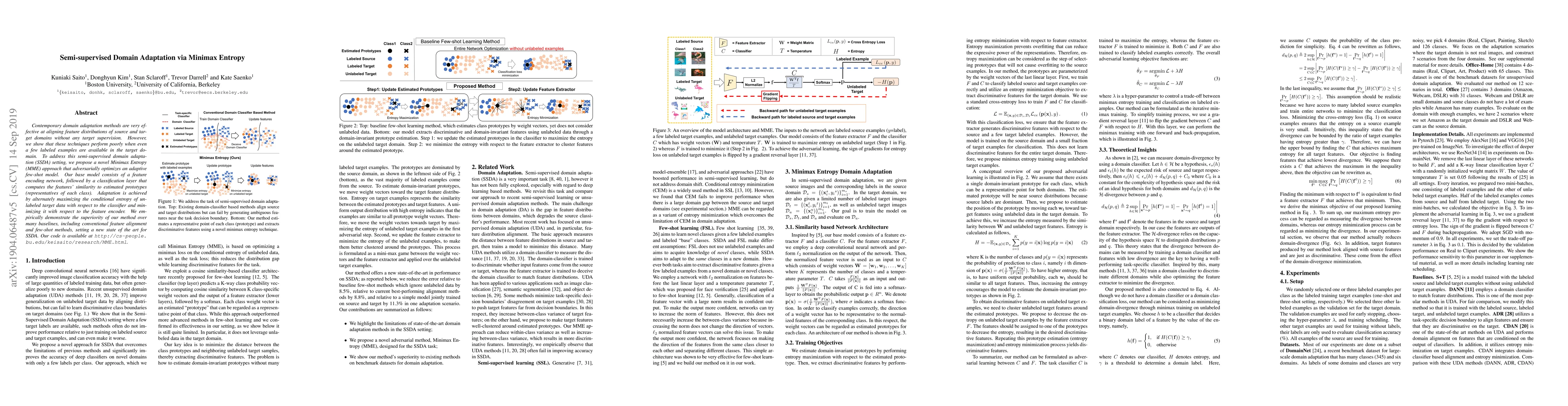 This paper proposes a Minimax Entropy (MME) approach for semi-supervised domain adaptation, which leverages a few labeled target examples to improve adaptation. The method optimizes an adaptive few-shot model by alternately maximizing and minimizing the conditional entropy of unlabeled target data, achieving superior performance over baselines.