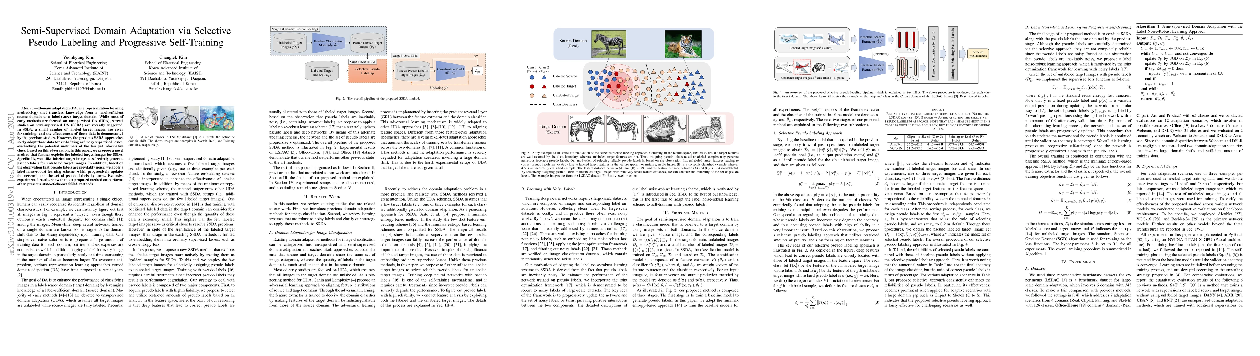 This paper proposes a novel semi-supervised domain adaptation method that leverages a small number of labeled target images to generate pseudo labels for unlabeled target images, followed by a progressive self-training approach to mitigate label noise, achieving superior performance compared to previous methods.